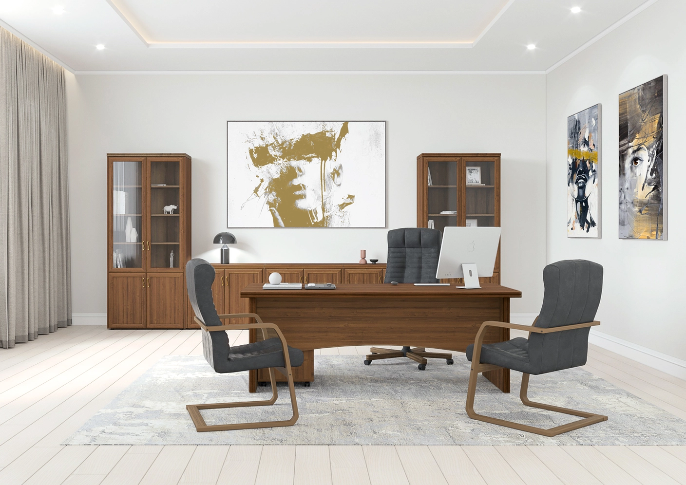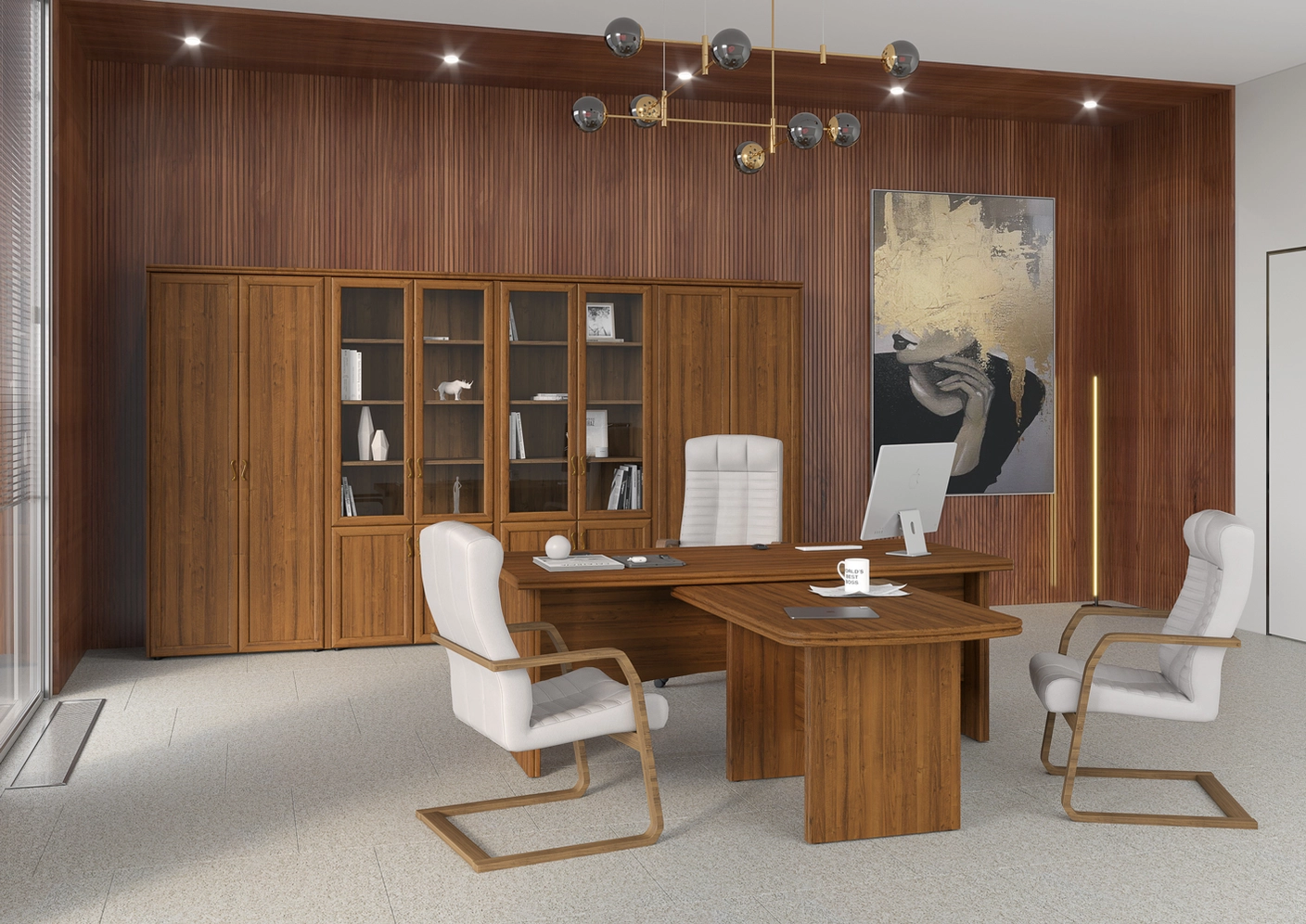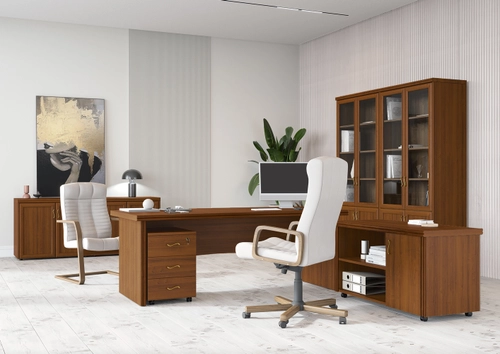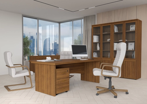 Офисная мебель МАСТЕР характеризуется экономичностью и в то же время соответствует консервативным представлениям о престижности и солидности директорской мебели. Офисная мебель этой серии выполнена в излюбленном цвете итальянских мебельщиков — благородный «Темный орех».