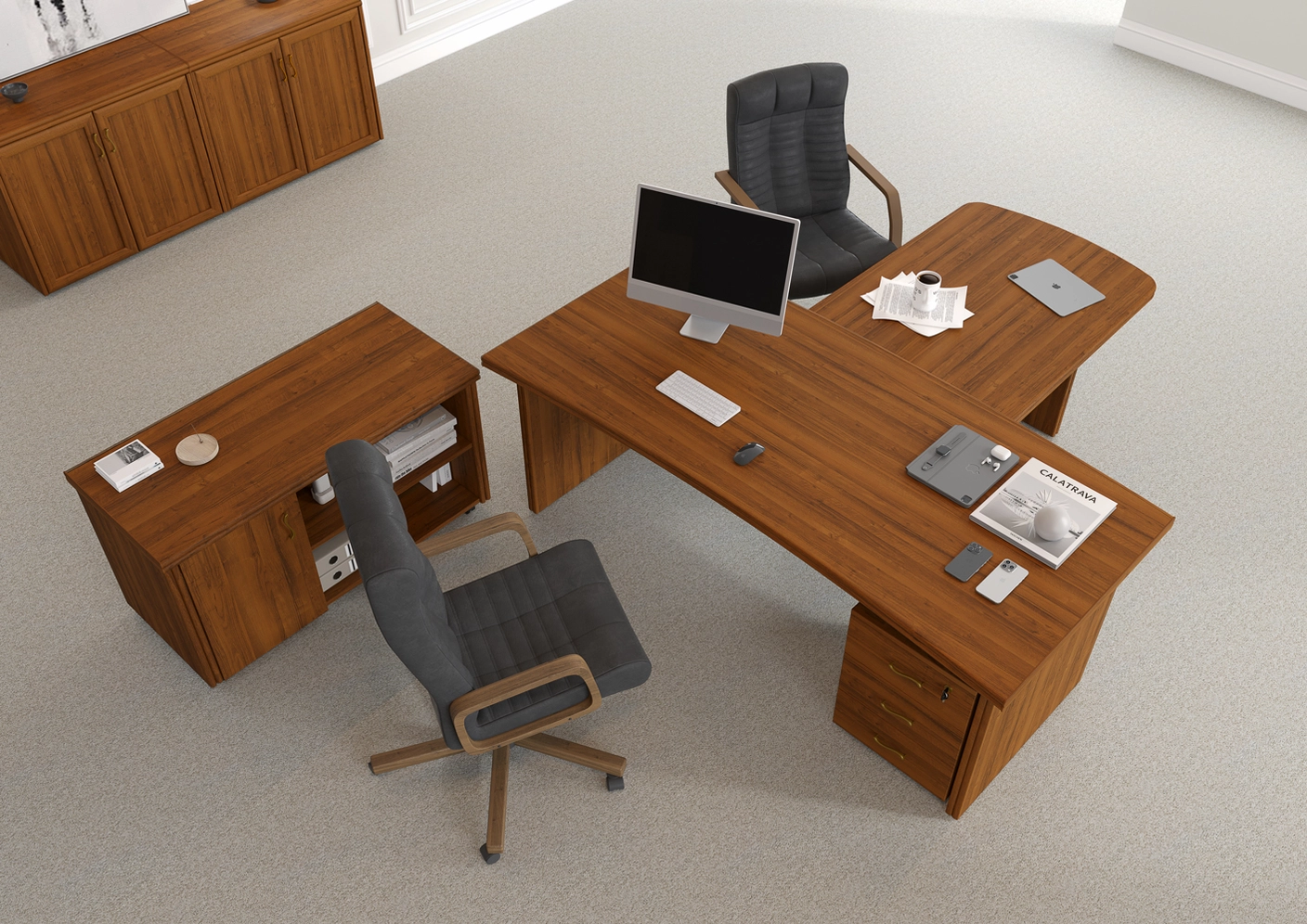 Кабинеты руководителя МАСТЕР сочетают в себе верность традициям и свежесть оригинальных идей. Симметрично изогнутые края столешницы, облицованные декоративным профилем ПВХ, делают рабочее место эргономичным и вносят динамику в дизайн рабочего стола.