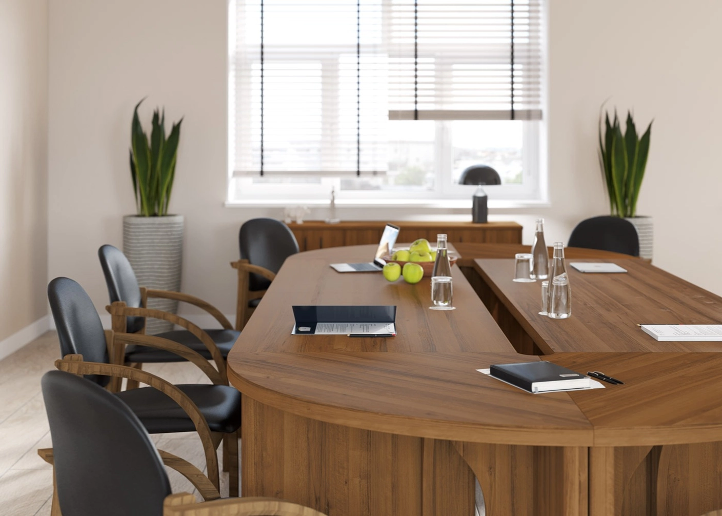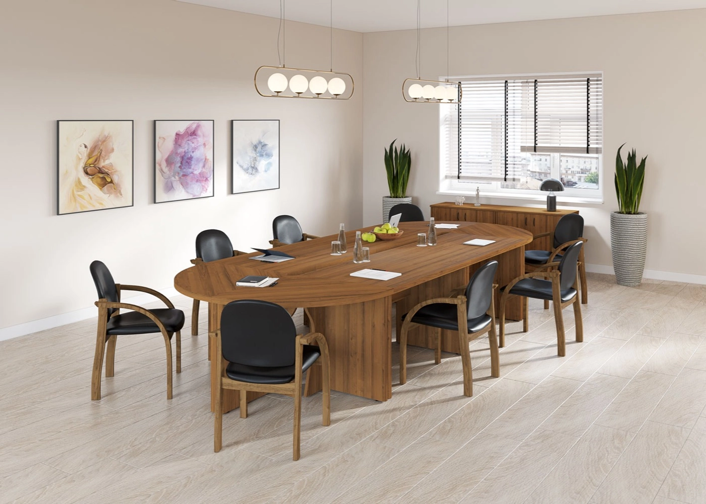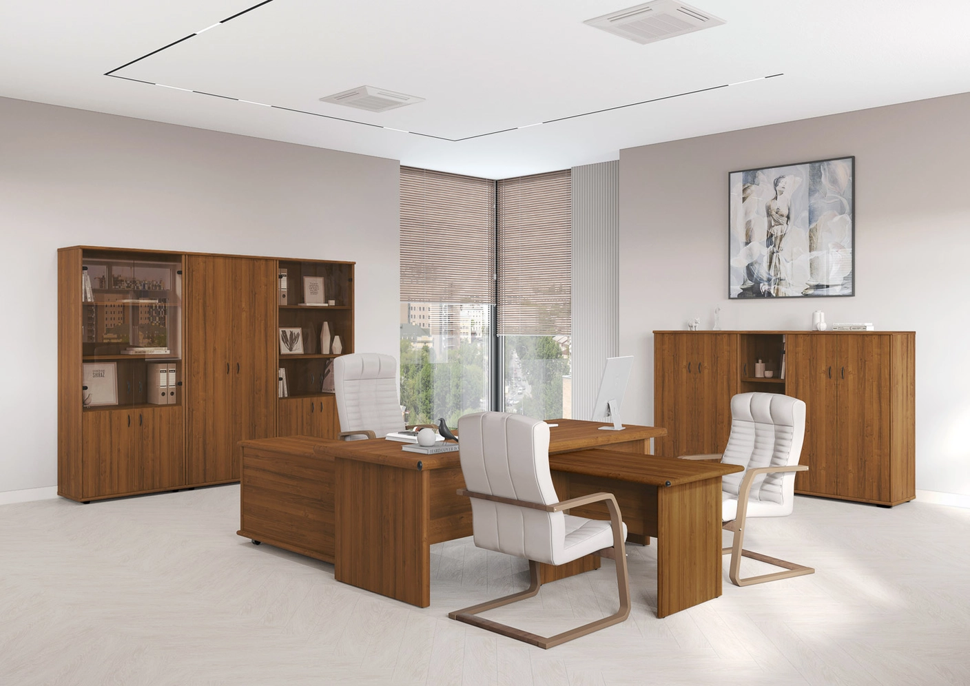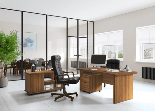 В составе кабинета присутствует модульная линейка переговорных столов, состоящих из прямых и угловых секций.