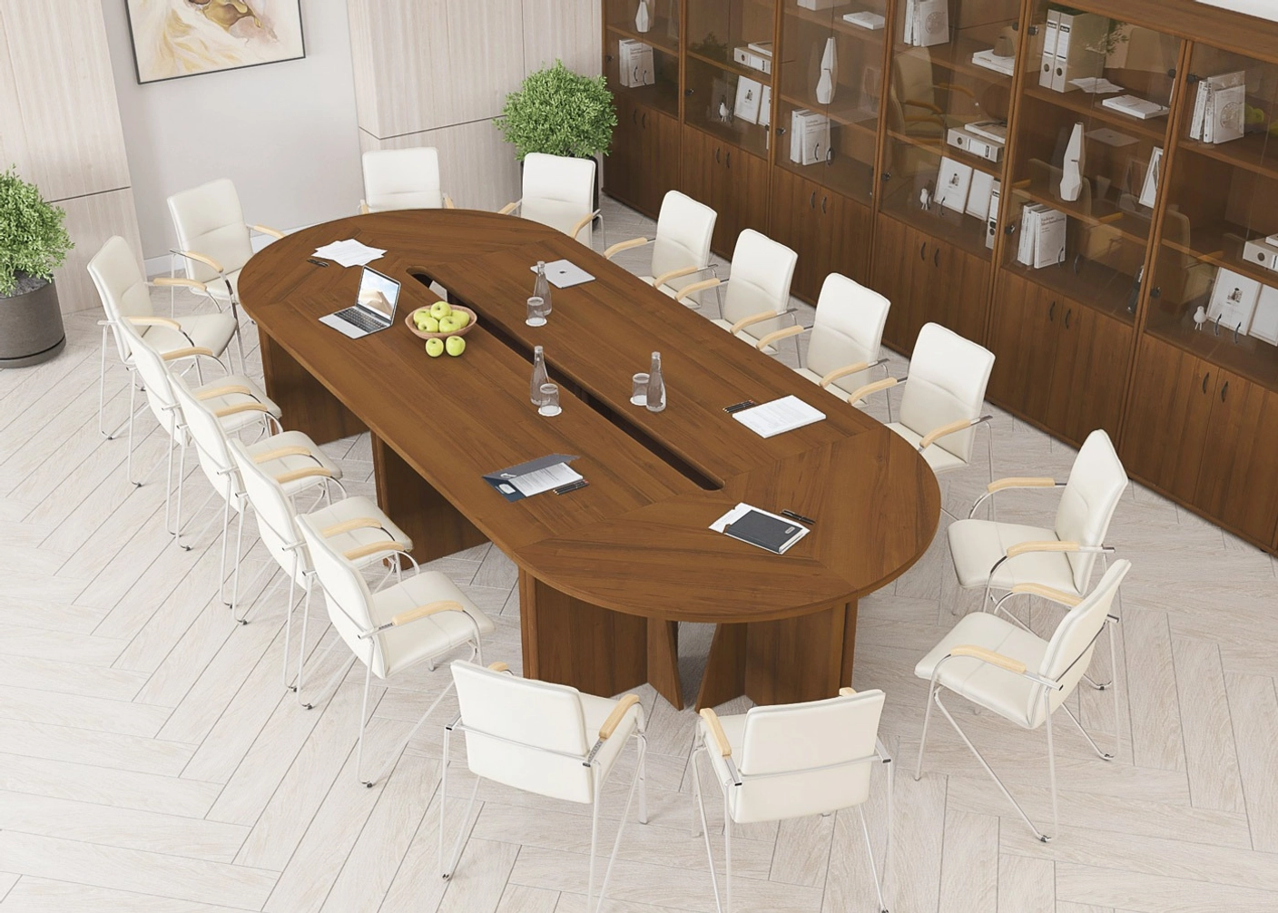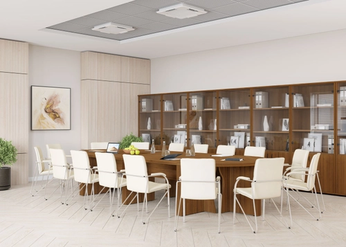 Большой выбор столов для переговорных зон разнообразных форм: прямоугольные, овальные, круглые.