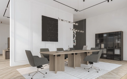 - Комбинация древесного и однотонного декоров в столах руководителя, тумбах, шкафах.