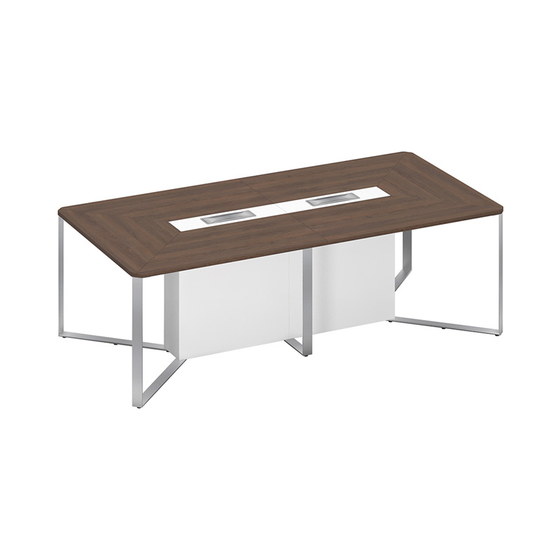 - Наличие прямоугольного проема в столешнице, закрытого вставками из ЛДСтП с установленными в них декоративными металлическими заглушками для скрытого размещения проводки